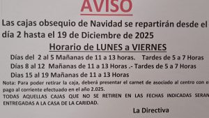 LAS CAJAS DE NAVIDAD DE ESTE AÑO SE REPARTIRÁN DESDE EL MARTES DÍA 2 DE DICIEMBRE EN LOS SIGUIENTES HORARIOS: