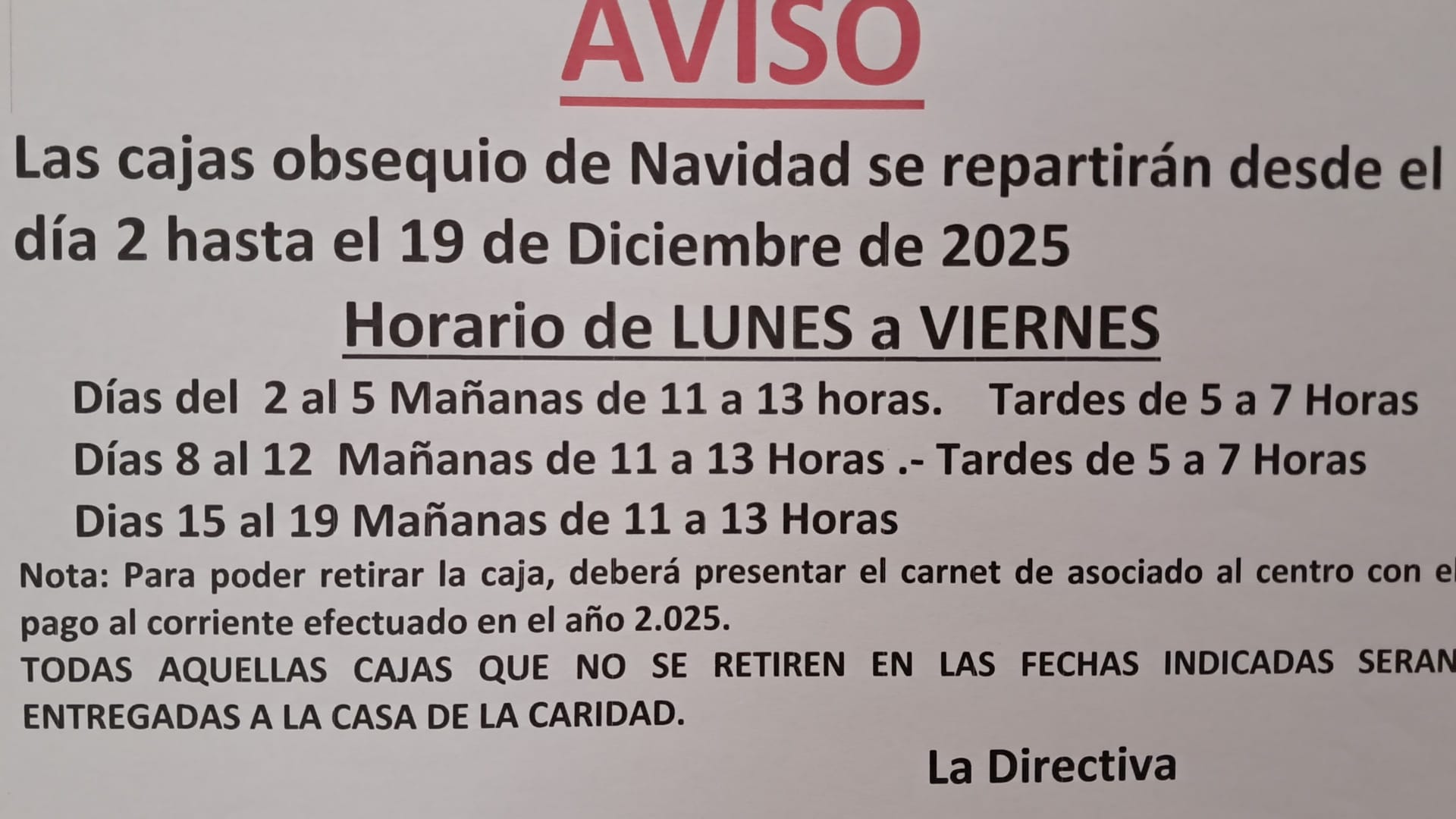 LAS CAJAS DE NAVIDAD DEL AÑO 2025 OBSEQUIO DEL CENTRO A TODOS LOS SOCIOS Y SOCIAS, SE REPARTIRÁN DESDE EL DÍA 1 AL 19 DE DICIEMBRE.