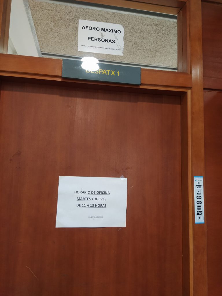 Secretaría o Despacho 1: El horario de atención preferentemente es de 11:00 a 13:00 h los MARTES Y JUEVES. Ante cualquier necesidad o urgencia preguntar a cualquier socio dónde localizar en el centro a algún componente de la directiva.
