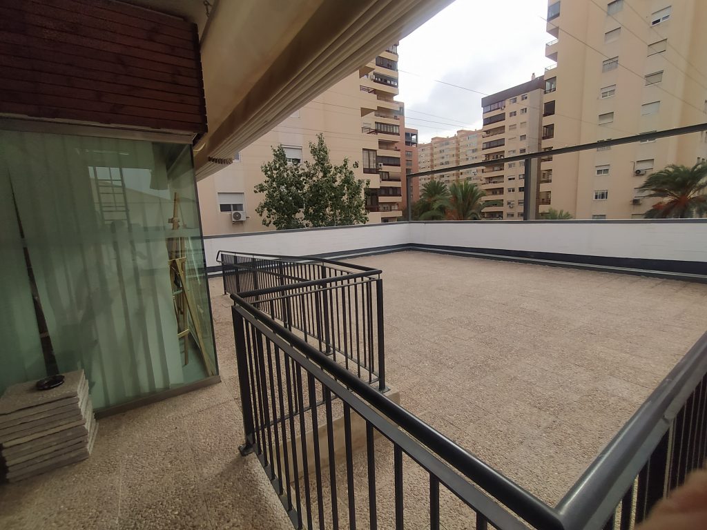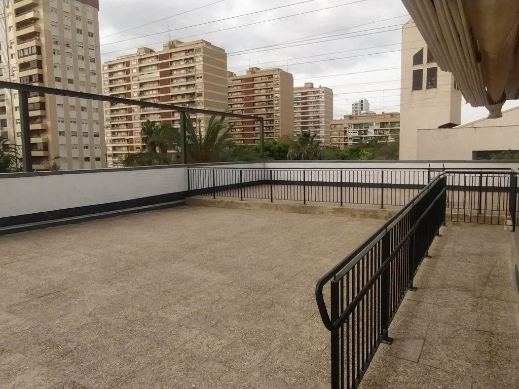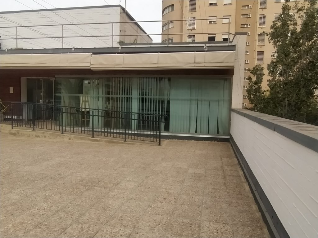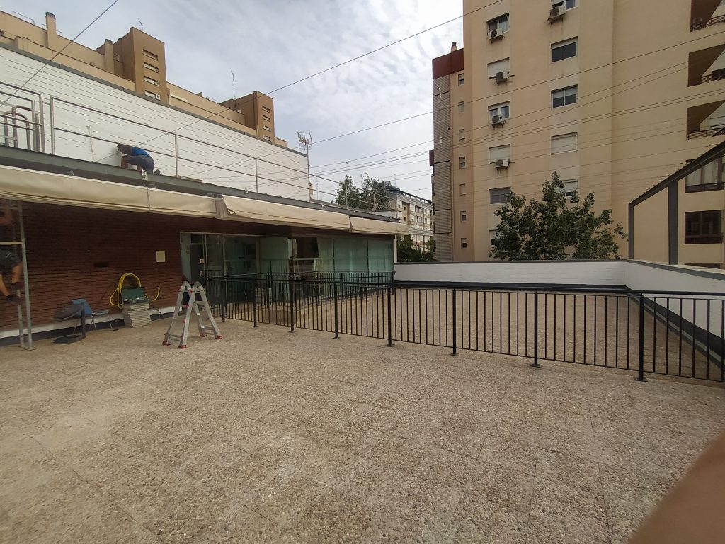 TERRAZA: Zona imprescindible del edificio en donde disfrutar del buen tiempo. Es utilizada además para algunas Actividades como la Gimnasia o Baile si se necesita porque el aula Multiusos esté ocupada en esos momentos y apetece estar al aire libre. Amplio espacio acondicionado con grandes toldos retráctiles a motor que cubren y protegen del sol intenso que tenemos en Valencia a menudo.
